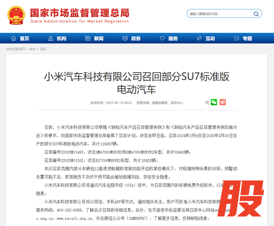 9月19日,国家市场监督管理总局消息,日前,小米汽车科技有限公司根据《缺陷汽车产品召回管理条例》和《缺陷汽车产品召回管理条例实施办法》的要求,向国家市场监督管理总局备案了召回计划。决定自即日起,召回2024年2月6日至2025年8月30日生产的部分SU7标准版电动汽车,共计116887辆。