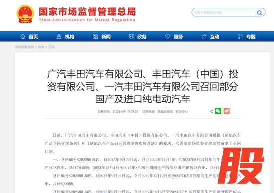 国家市场监管总局9月19日还公布,日前,广汽丰田汽车有限公司、丰田汽车(中国)投资有限公司、一汽丰田汽车有限公司、斯巴鲁汽车(中国)有限公司根据《缺陷汽车产品召回管理条例》和《缺陷汽车产品召回管理条例实施办法》的要求,向国家市场监督管理总局备案了召回计划。